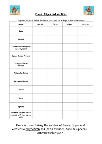 Faces, Edges & Vertices Worksheets | K5 Learning Activities in these worksheets include counting the faces, edges and vertices of common 3D shapes and using the number of faces / edges / vertices to describe shapes. Counting faces, edges & vertices: Worksheet #1 Comparing faces, edges & vertices of different shapes: Worksheet #2 Describing 3D shapes: Worksheet #3 Worksheet #4 Similar: