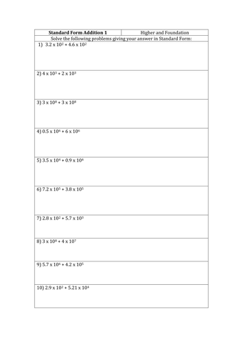 Standard Form worksheets - WorksheetMath Adding in standard form Adding two numbers given in standard form. Subtracting in standard form Subtracting two numbers given in standard form. Add and subtract in standard form Adding and subtracting two numbers given in standard form. Multiply standard form Multiplying two numbers given in standard form. Divide standard form