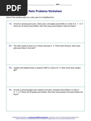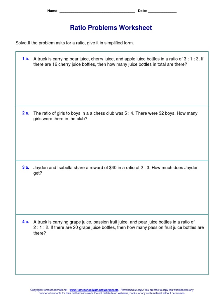 Homeschool math worksheets ratio word problems. Ratio Word Problems | Worksheet | Education.com These sixth-grade ratio word problems are a great way to illustrate the many different ways ratios can be used and applied in real-life situations. Help your students develop their ratio reasoning and their understanding of equivalent ratios as they work their way through these relatable word problems. Download Worksheet View answers 9th Grade Math Worksheets | Worksheets Worksheets Free 9th Grade Math Worksheets for Teachers, Parents, and Kids. Easily download and print our 9th grade math worksheets. Click on the free 9th grade math worksheet you would like to print or download. This will take you to the individual page of the worksheet. You will then have two choices. You can either print the screen utilizing the large ... PDF Ratio and Rates Word Problems - Effortless Math Name: _____Math Worksheets Date: _____ … So Much More Online! Please visit: Ratio and Rates Word Problems Solve each word problem. 1) Bob has 12 red cards and 20 green cards. What is the ratio of Bob's red cards to his green cards? _____ 2) In a party, 10 soft drinks are required for every 12 guests. If there are 252 Ratio Word Problems Worksheets - Worksheets Key Ratio word problem. These word problems can easily be solved by students using simple ratios. Goodworksheets offers free printable math worksheets. These word problems can be solved by students using simple ratios. The arithmetic is simplified to allow students to understand the concept of ratios. Download